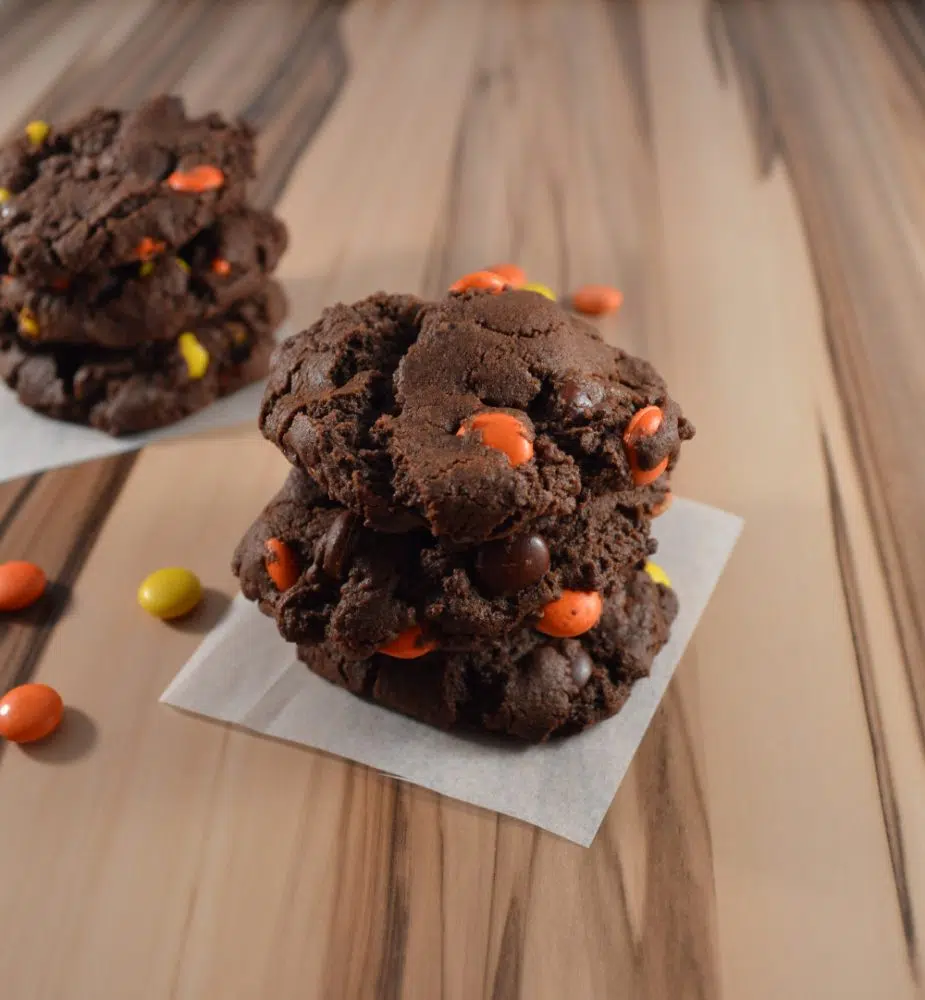 That’s when I decided to make these Chocolate Cookies with Autumn Candies. I always loved the idea of “reverse chocolate chip cookies” but wanted to add my own, special twist. This recipe works with any candy that you desire… you can even opt in for walnuts or pecans! For my batch, I decided to go for Reese’s Pieces because of their Fall-themed colors.