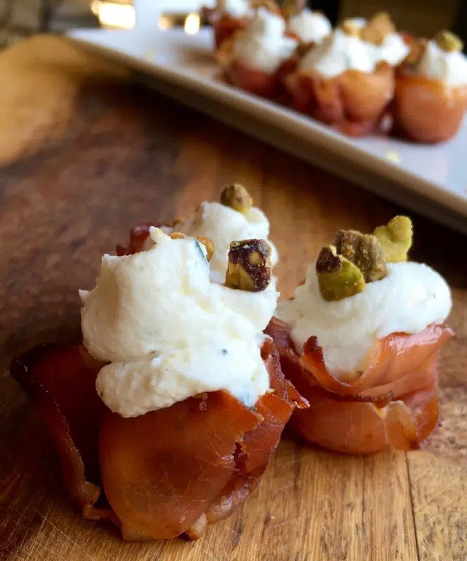 - Once prosciutto baskets are cool to the touch, transfer cheese mixture to a plastic sandwich bag. Cut a small tip off one corner and pipe cheese mixture into each prosciutto basket. Top each cheese-filled basket with chopped pistachios.